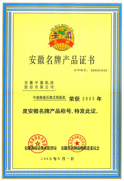 “中德牌”剪板机荣获2005年“安徽名牌产物”称呼